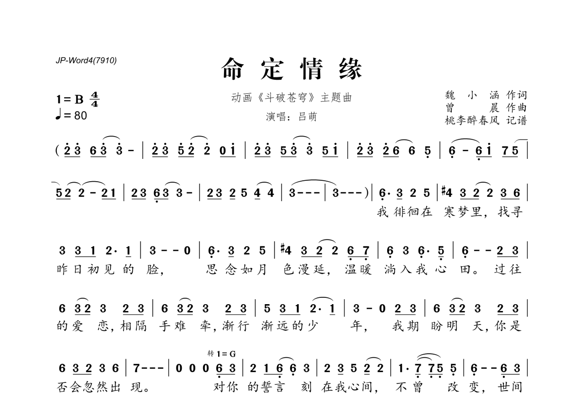 《命定情缘》是吕萌演唱的一首歌曲,拍号为4/4拍,歌曲速度为每分钟80拍,这份简谱共有一张高清图谱,图谱由 @桃李醉春风 编配上传。