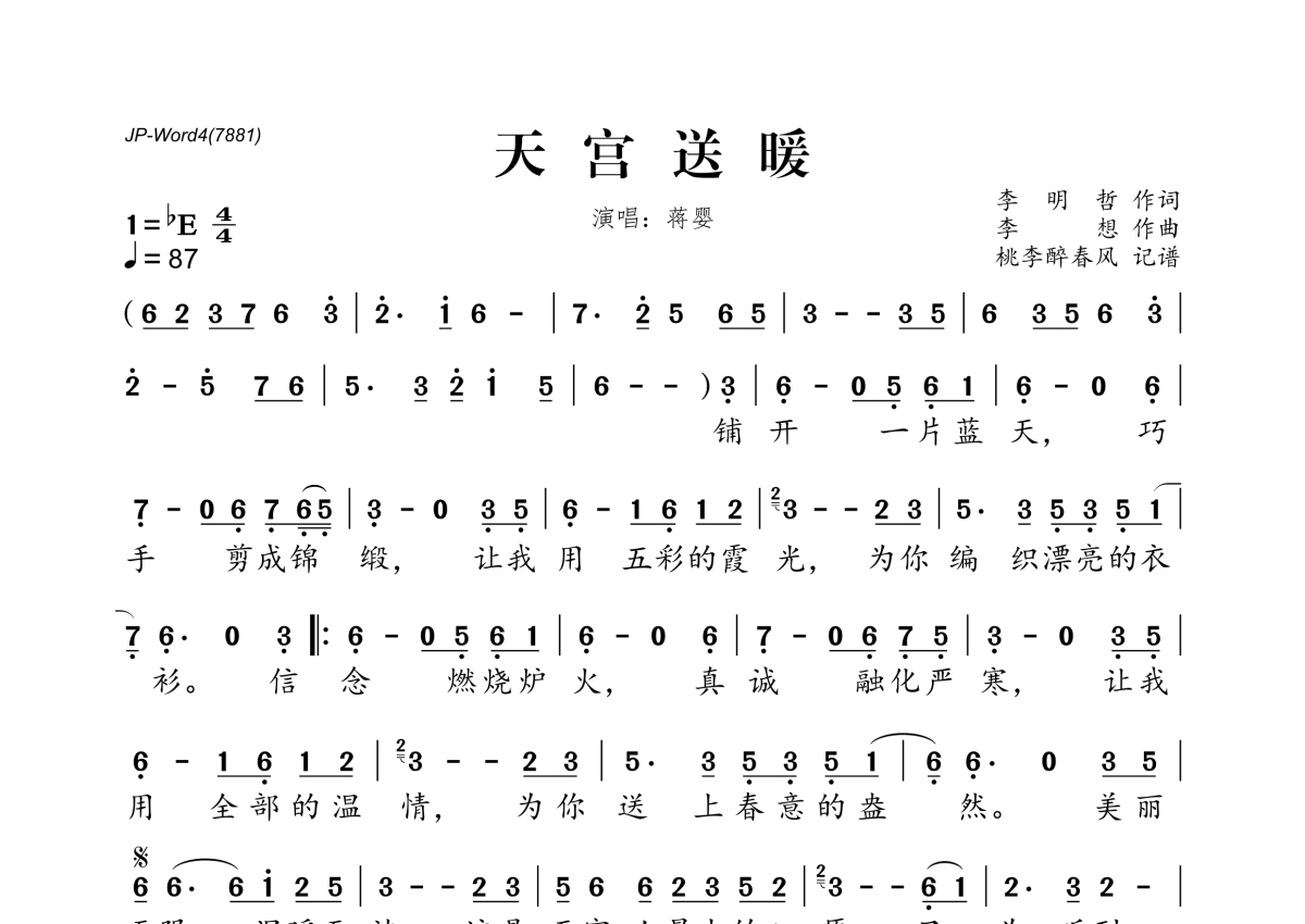 《天宫送暖》是蒋婴演唱的一首歌曲,拍号为4/4拍,歌曲速度为每分钟87拍,这份简谱共有一张高清图谱,图谱由 @桃李醉春风 编配上传。