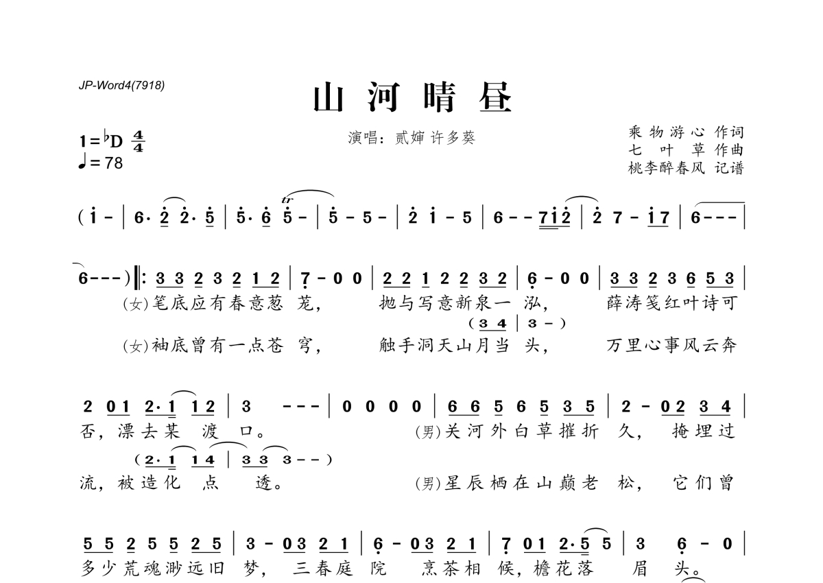 《山河晴昼》是贰婶&许多葵演唱的一首歌曲,拍号为4/4拍,歌曲速度为每分钟78拍,这份简谱共有两张高清图谱,图谱由 @桃李醉春风 编配上传。