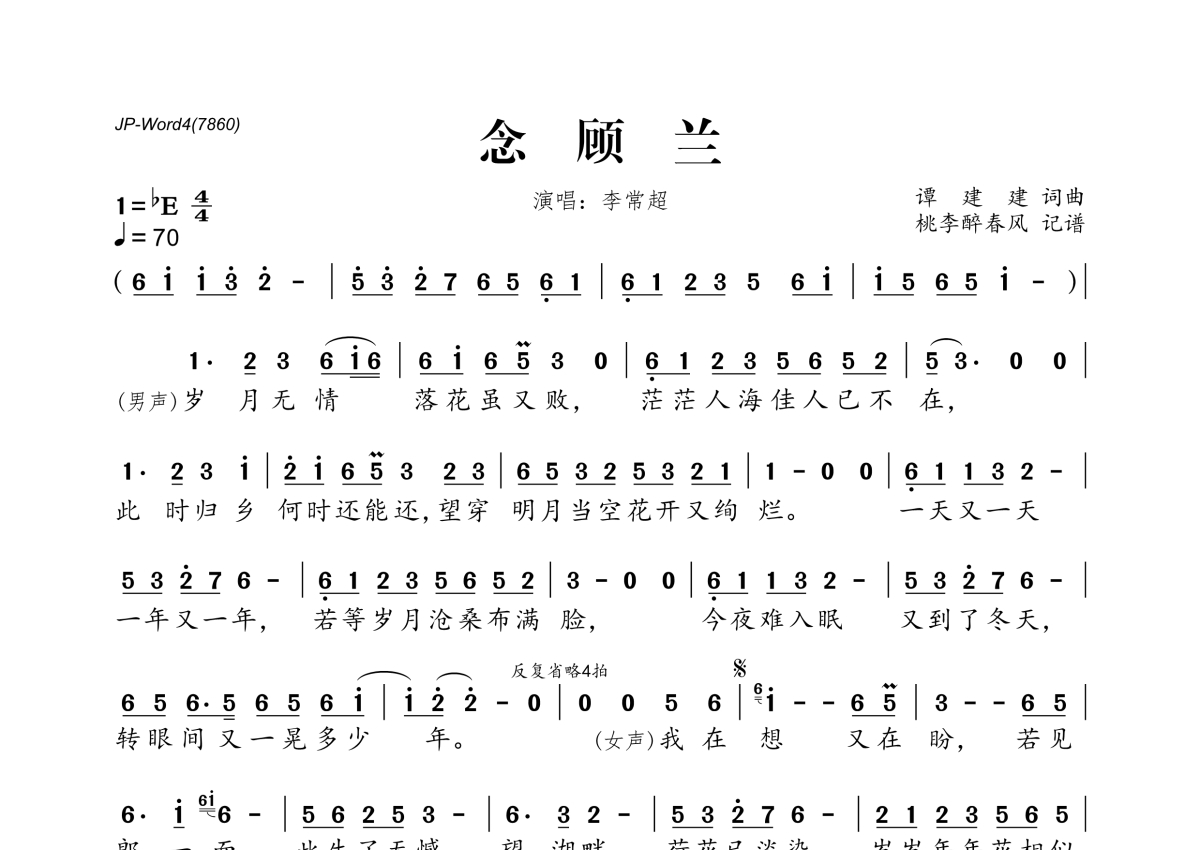 《念顾兰》是李常超(Lao乾妈)演唱的一首歌曲,拍号为4/4拍,歌曲速度为每分钟70拍,这份简谱共有一张高清图谱,图谱由 @桃李醉春风 编配上传。