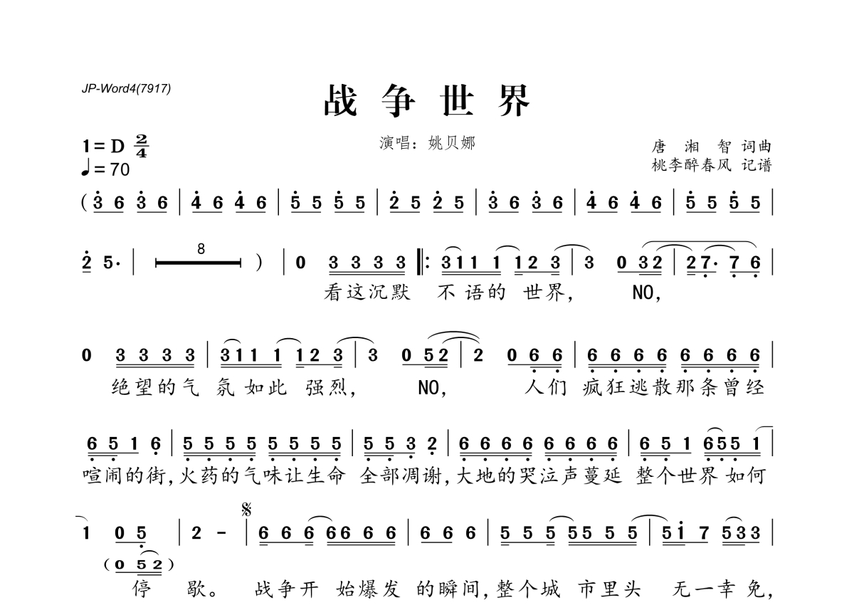 《战争世界》是姚贝娜演唱的一首歌曲,拍号为2/4拍,歌曲速度为每分钟70拍,这份简谱共有一张高清图谱,图谱由 @桃李醉春风 编配上传。