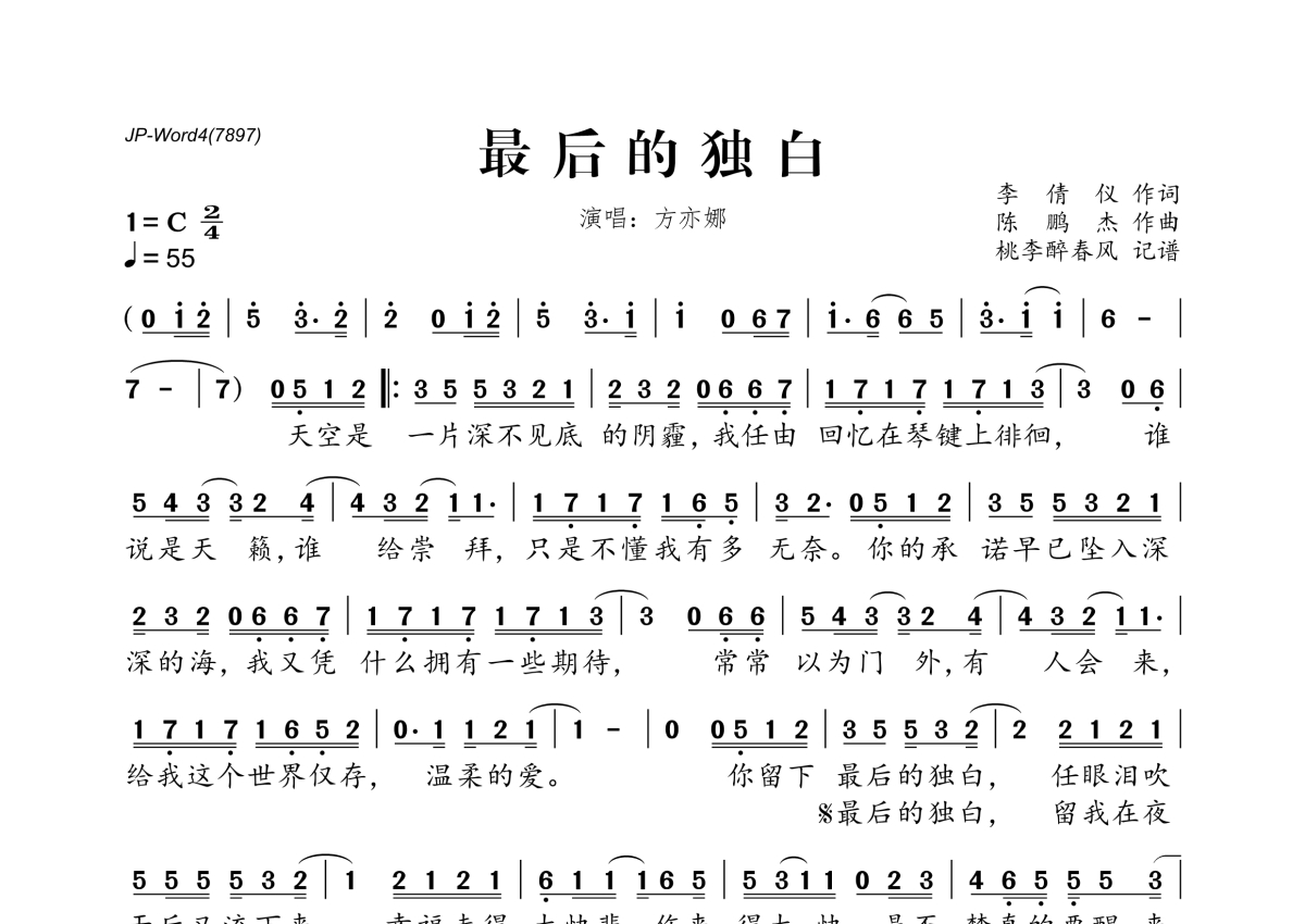 《最后的独白》是方亦娜演唱的一首歌曲,拍号为2/4拍,歌曲速度为每分钟55拍,这份简谱共有一张高清图谱,图谱由 @桃李醉春风 编配上传。