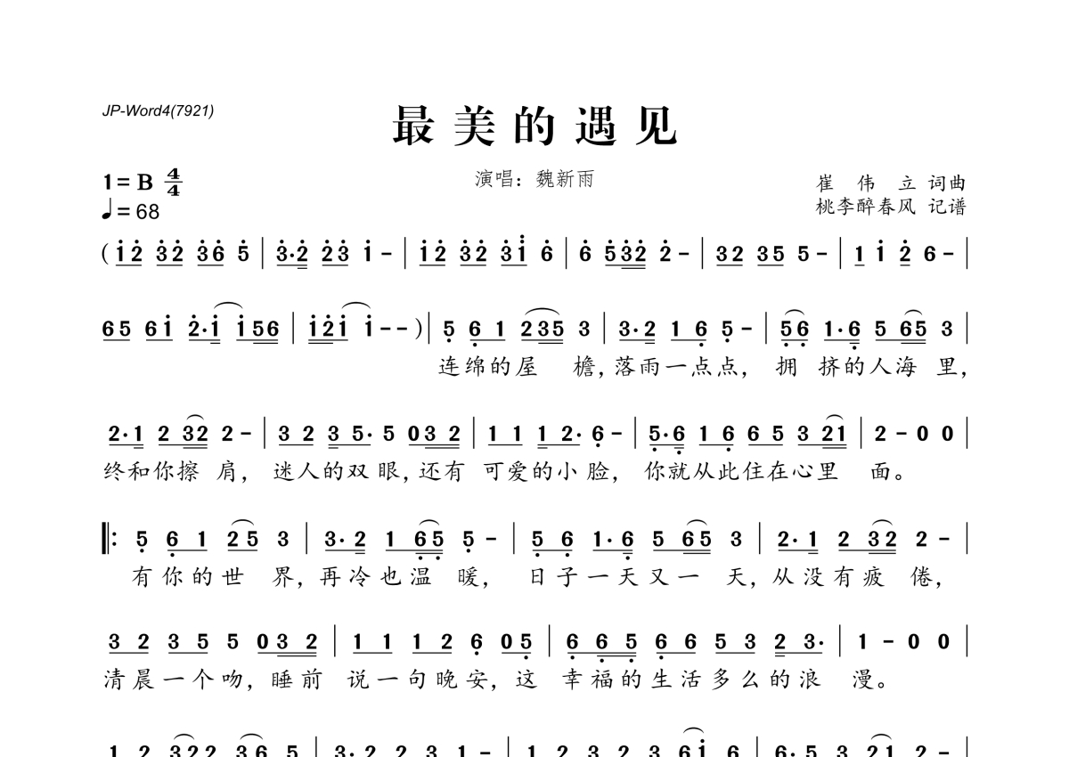 《最美的遇见》是魏新雨演唱的一首歌曲,拍号为4/4拍,歌曲速度为每分钟68拍,这份简谱共有一张高清图谱,图谱由 @桃李醉春风 编配上传。