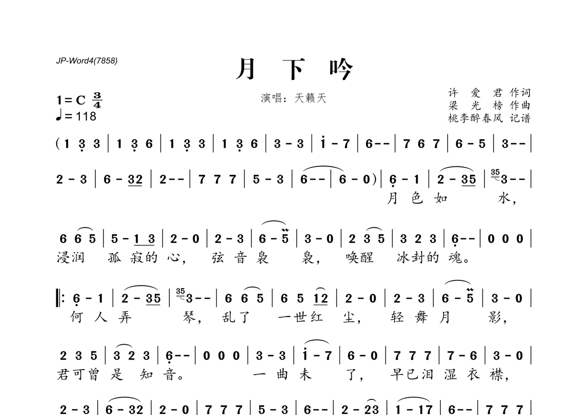 《月下吟》是天籁天演唱的一首歌曲,拍号为3/4拍,歌曲速度为每分钟118拍,这份简谱共有一张高清图谱,图谱由 @桃李醉春风 编配上传。