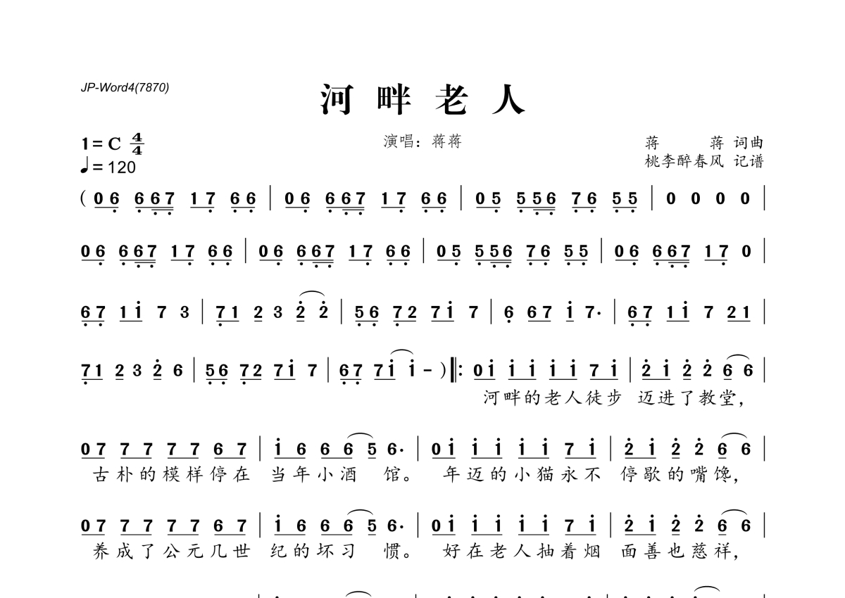 《河畔老人》是蒋蒋演唱的一首歌曲,拍号为4/4拍,歌曲速度为每分钟120拍,这份简谱共有一张高清图谱,图谱由 @桃李醉春风 编配上传。