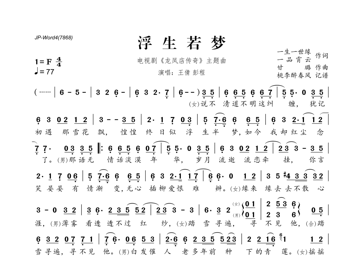 《浮生若梦》是王倩、彭程演唱的一首歌曲,拍号为4/4拍,歌曲速度为每分钟77拍,这份简谱共有一张高清图谱,图谱由 @桃李醉春风 编配上传。