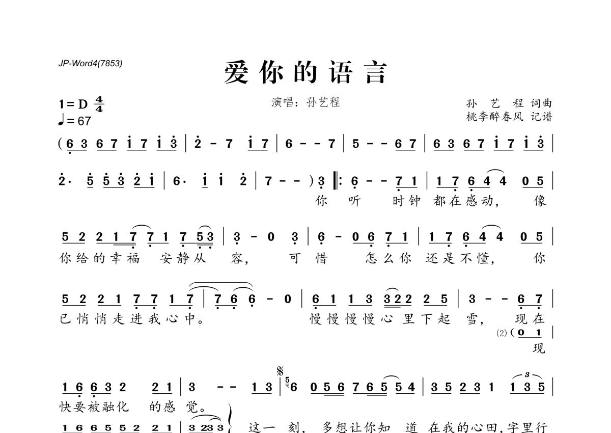 《爱你的语言》是孙艺程演唱的一首歌曲,拍号为4/4拍,歌曲速度为每分钟67拍,这份简谱共有一张高清图谱,图谱由 @桃李醉春风 编配上传。
