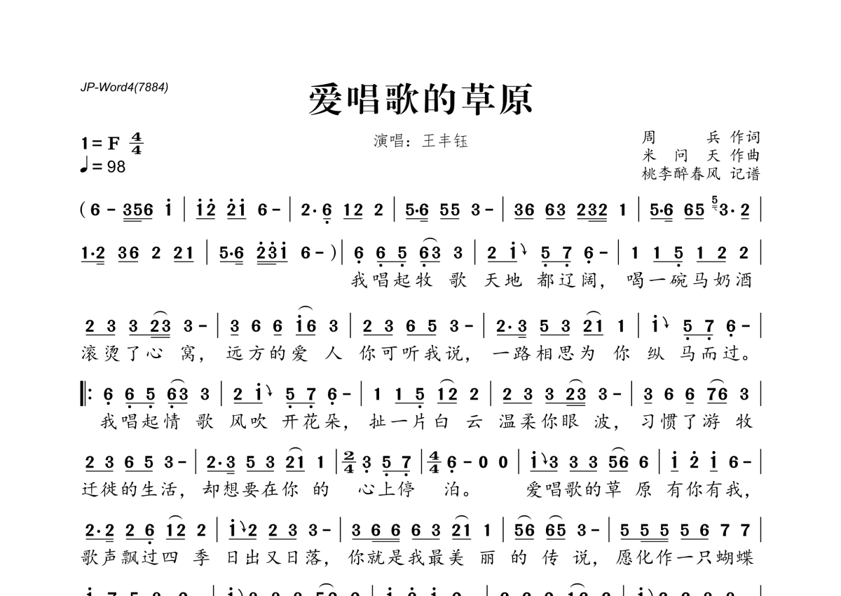 《爱唱歌的草原》是王丰钰演唱的一首歌曲,拍号为4/4拍,歌曲速度为每分钟96拍,这份简谱共有一张高清图谱,图谱由 @桃李醉春风 编配上传。