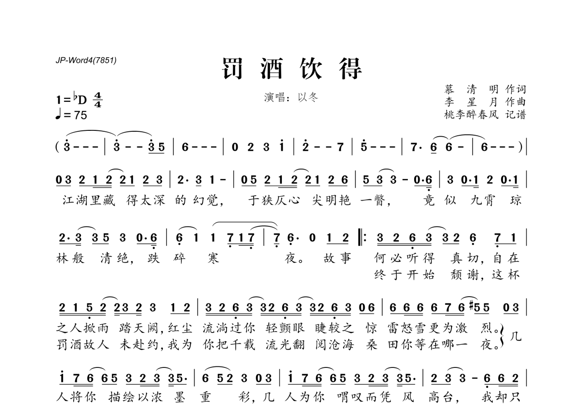 《罚酒饮得》是以冬演唱的一首歌曲,拍号为4/4拍,歌曲速度为每分钟75拍,这份简谱共有一张高清图谱,图谱由 @桃李醉春风 编配上传。