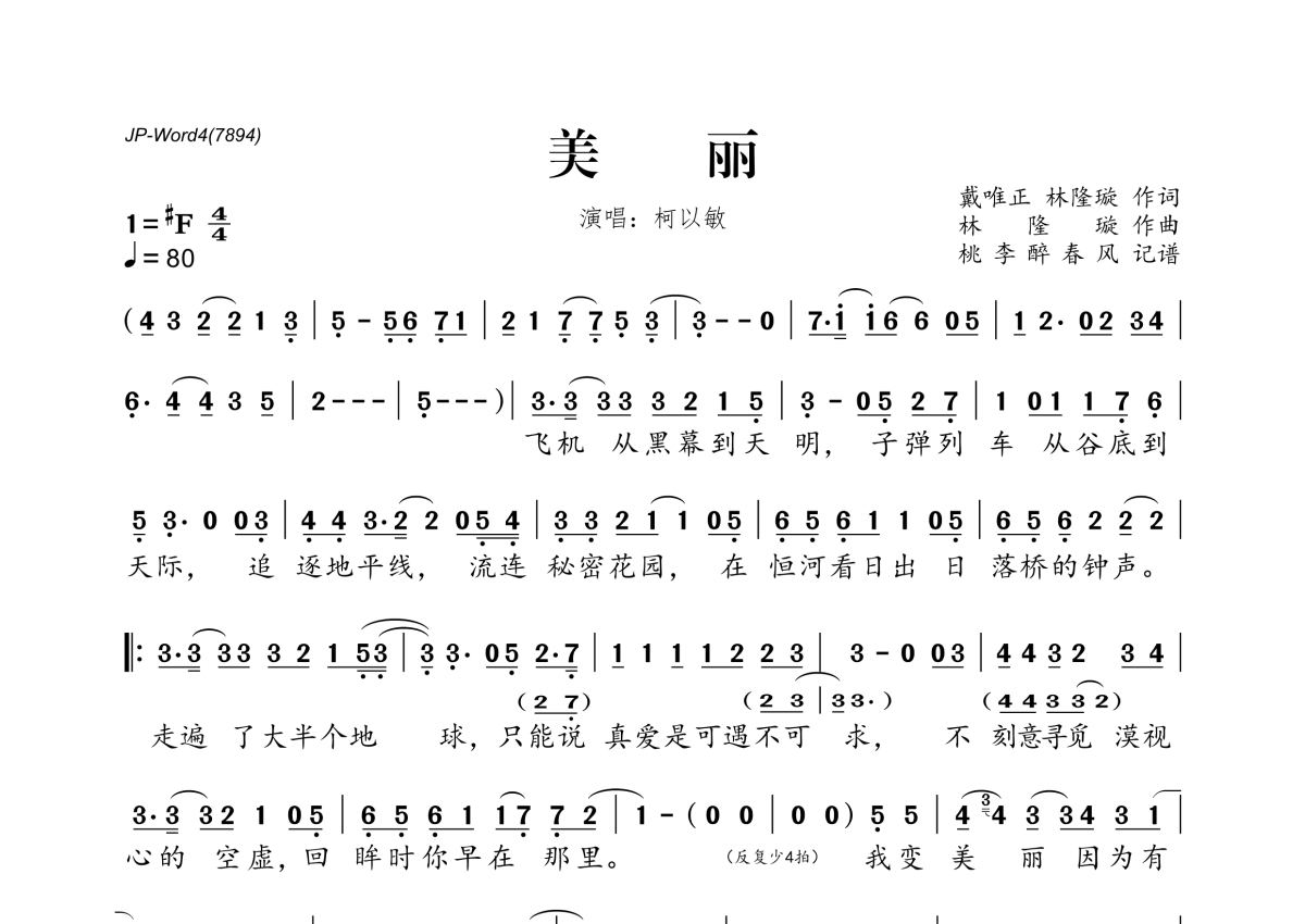《美丽》是柯以敏演唱的一首歌曲,拍号为4/4拍,歌曲速度为每分钟80拍,这份简谱共有一张高清图谱,图谱由 @桃李醉春风 编配上传。