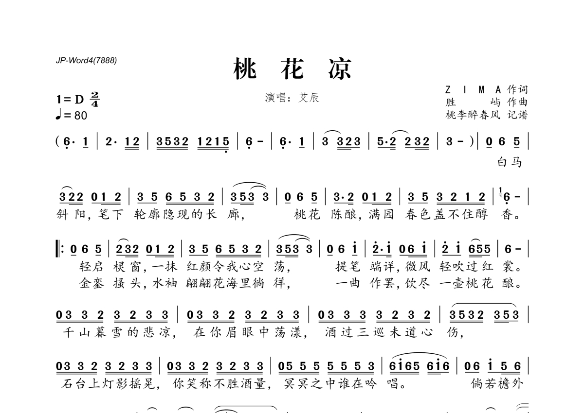《桃花凉》是艾辰演唱的一首歌曲,拍号为2/4拍,歌曲速度为每分钟80拍,这份简谱共有一张高清图谱,图谱由 @桃李醉春风 编配上传。