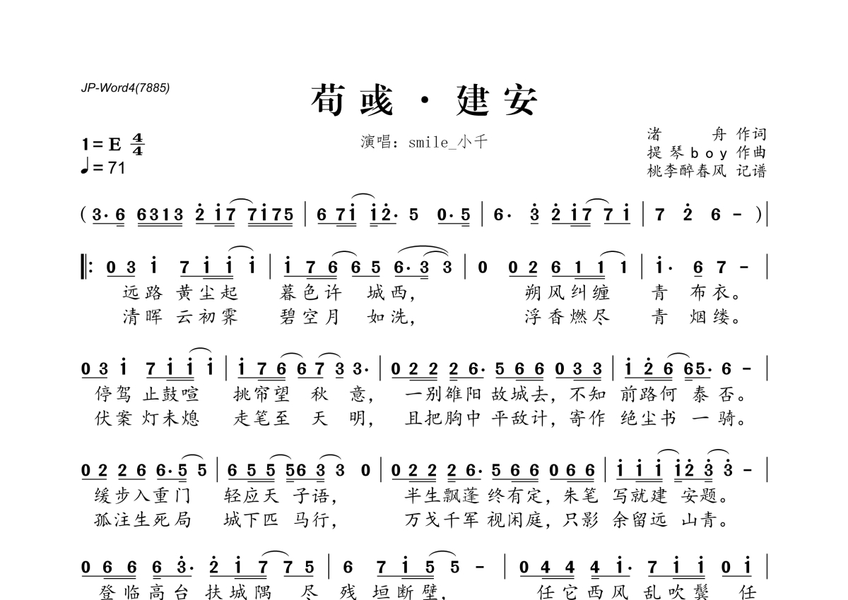《荀彧·建安》是Smile_小千演唱的一首歌曲,拍号为4/4拍,歌曲速度为每分钟71拍,这份简谱共有一张高清图谱,图谱由 @桃李醉春风 编配上传。