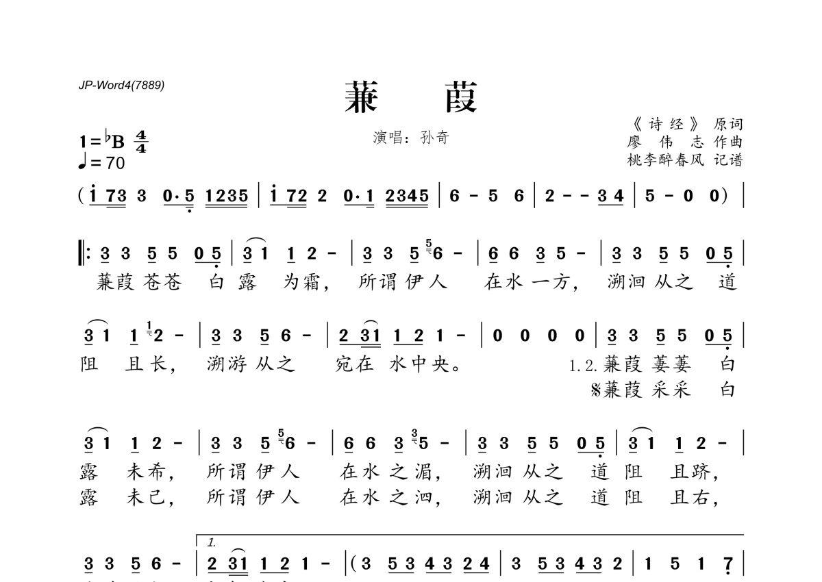 孙奇《蒹葭》简谱