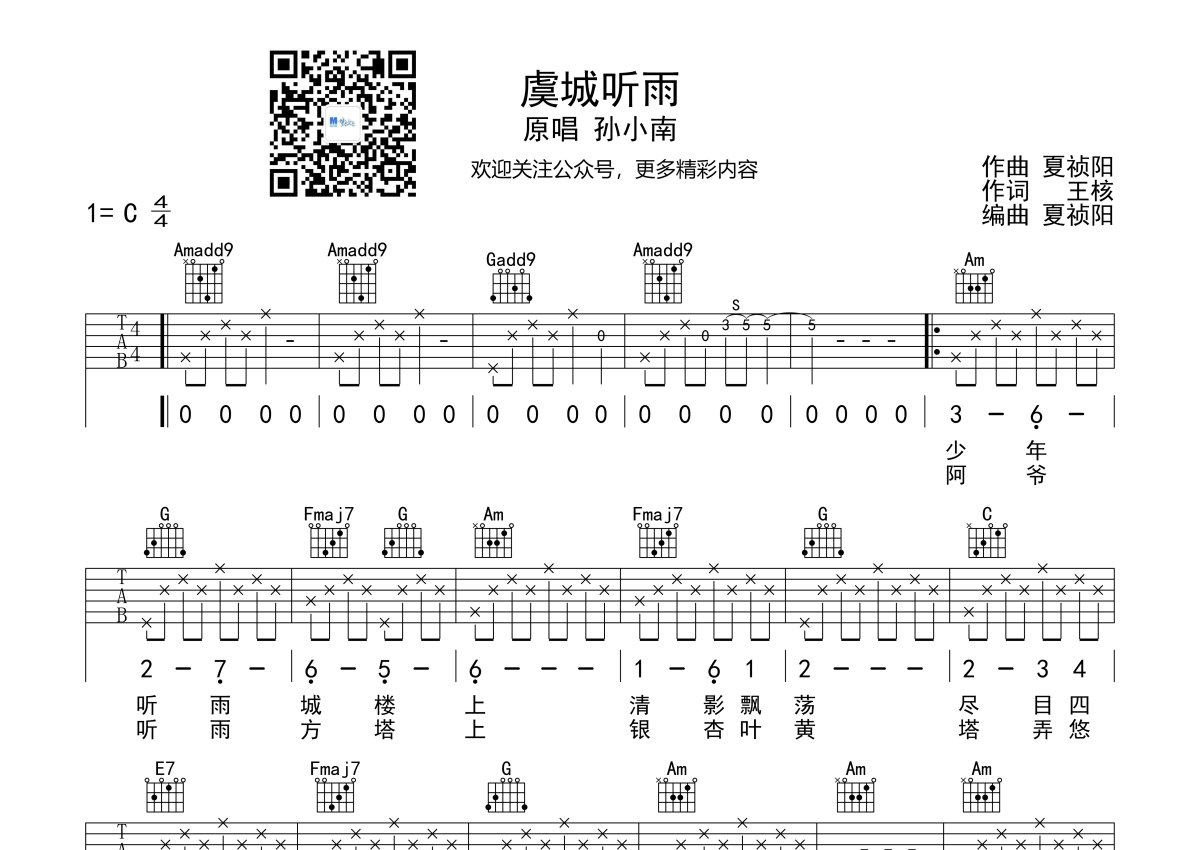 孙小南《虞城听雨》吉他谱 - C调弹唱六线谱