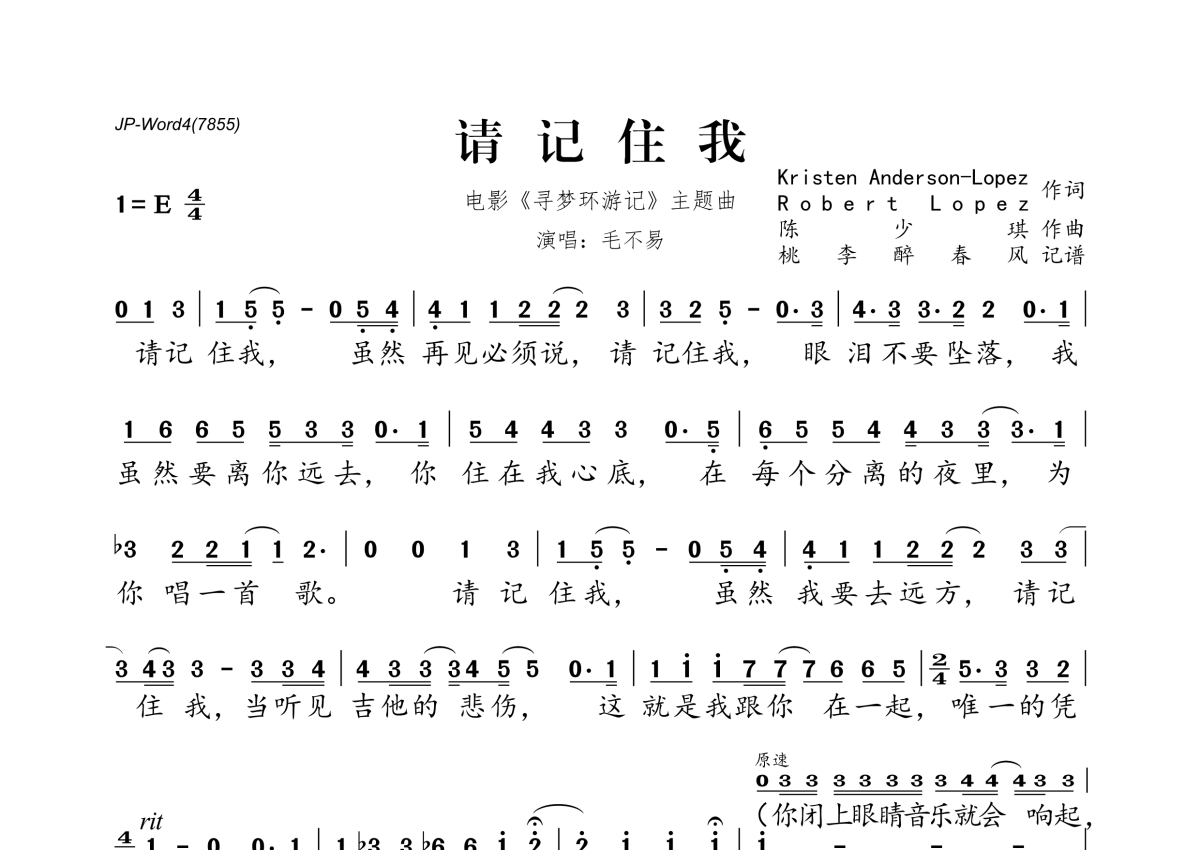 《请记住我》是毛不易演唱的一首歌曲,拍号为4/4拍,这份简谱共有两张高清图谱,图谱由 @桃李醉春风 编配上传。