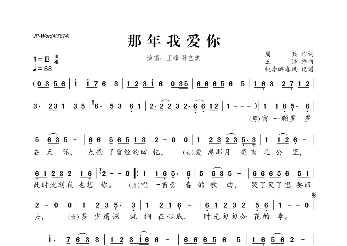 《那年我爱你》是王峰&孙艺琪演唱的一首歌曲,拍号为4/4拍,歌曲速度为每分钟88拍,这份简谱共有一张高清图谱,图谱由 @桃李醉春风 编配上传。
