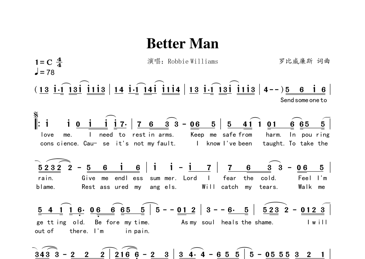 《Better Man》是RobbieWilliams演唱的一首歌曲,拍号为4/4拍,歌曲速度为每分钟78拍,这份简谱共有一张高清图谱,图谱由 @桃李醉春风 编配上传。