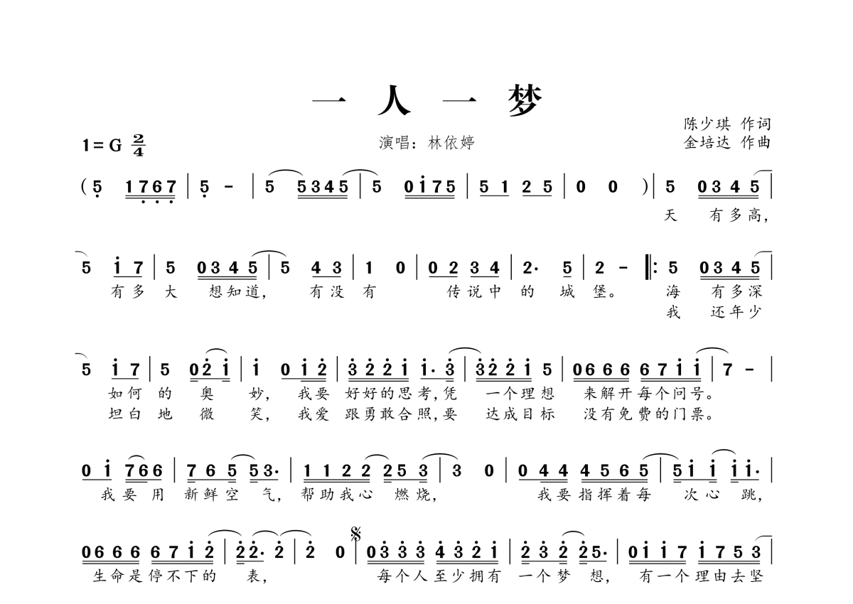《一人一梦》是林依婷演唱的一首歌曲,拍号为2/4拍,这份简谱共有一张高清图谱,图谱由 @桃李醉春风 编配上传。