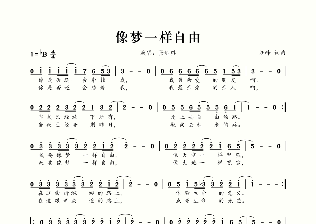 《像梦一样自由》是张钰琪演唱的一首歌曲,拍号为4/4拍,这份简谱共有一张高清图谱,图谱由 @桃李醉春风 编配上传。