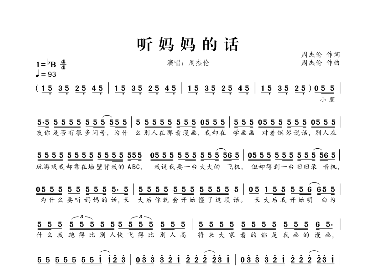 《听妈妈的话》是周杰伦演唱的一首歌曲,拍号为4/4拍,歌曲速度为每分钟93拍,这份简谱共有两张高清图谱,图谱由 @桃李醉春风 编配上传。