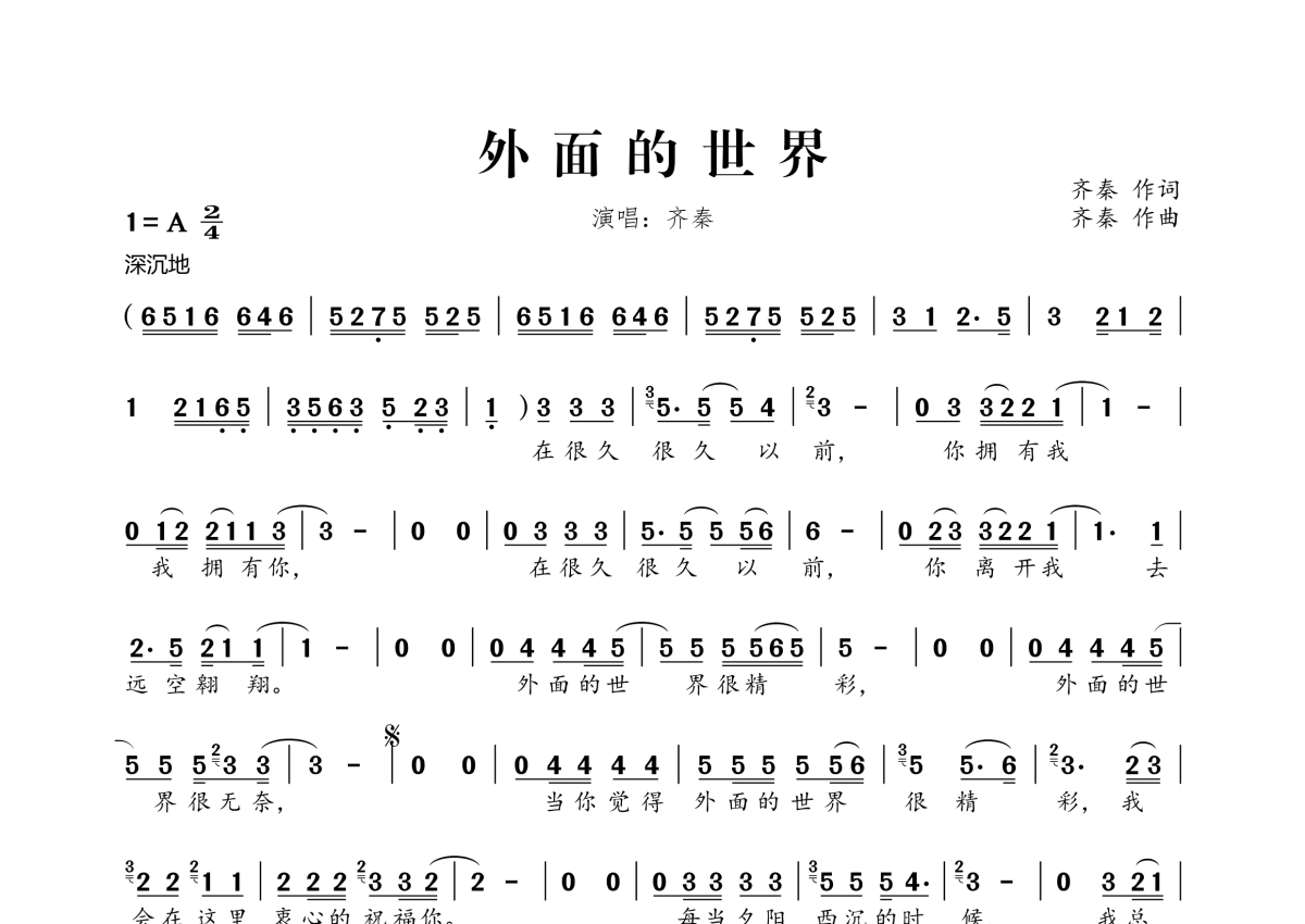 《外面的世界》是齐秦演唱的一首歌曲,拍号为2/4拍,这份简谱共有一张高清图谱,图谱由 @桃李醉春风 编配上传。