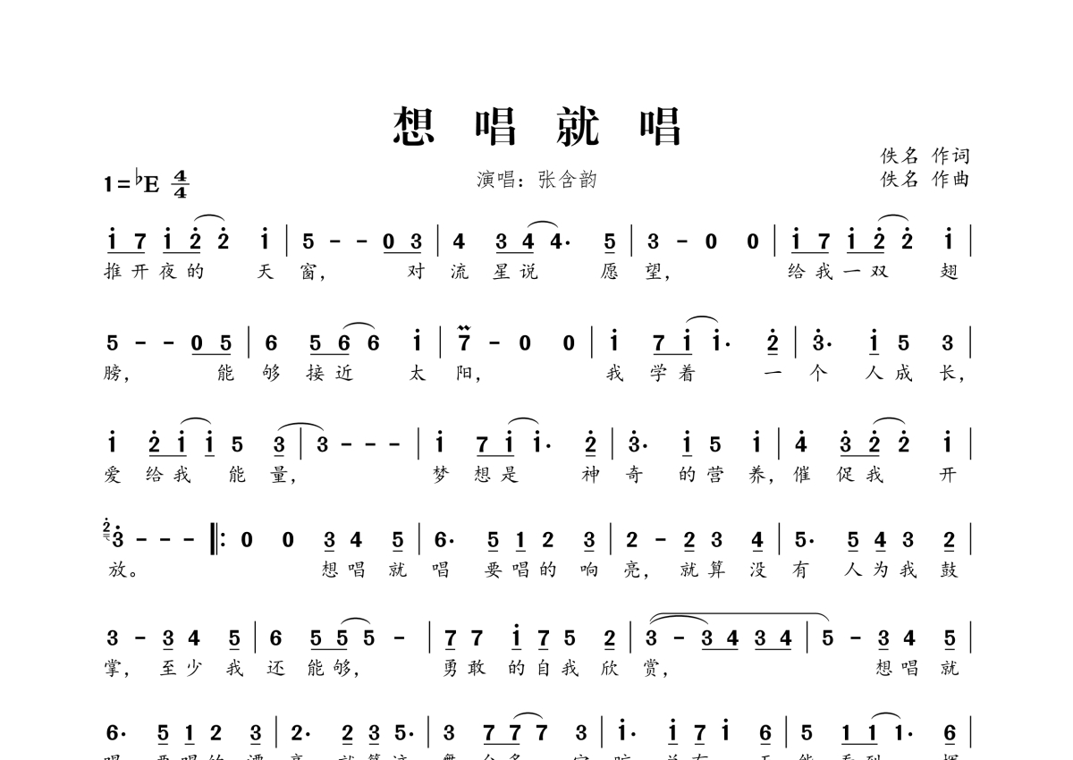 《想唱就唱》是张含韵演唱的一首歌曲,拍号为4/4拍,这份简谱共有一张高清图谱,图谱由 @桃李醉春风 编配上传。