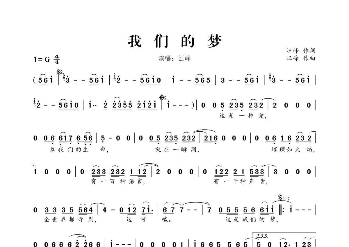 《我们的梦》是汪峰演唱的一首歌曲,拍号为4/4拍,这份简谱共有一张高清图谱,图谱由 @桃李醉春风 编配上传。