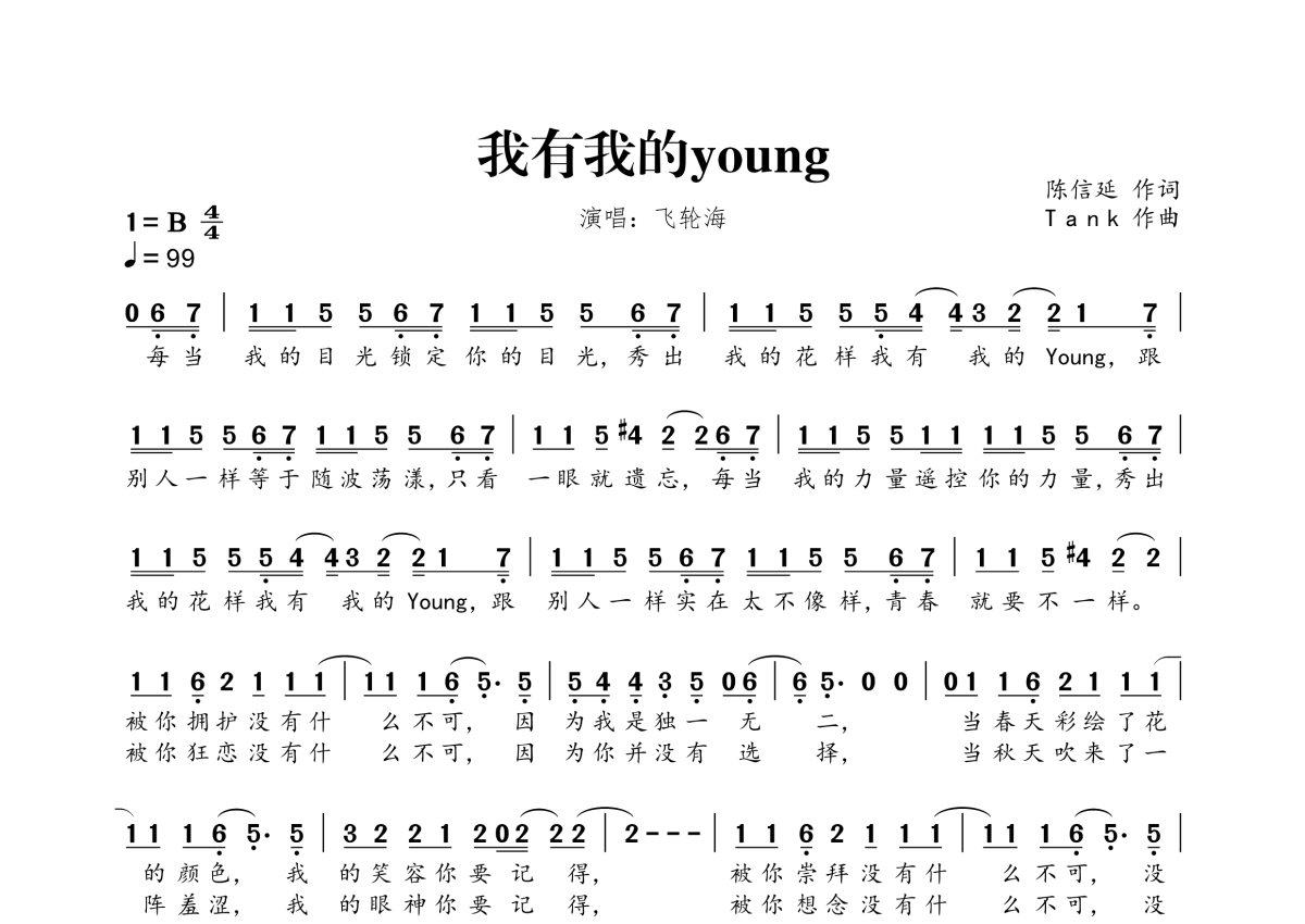 《我有我的young》是飞轮海演唱的一首歌曲,拍号为4/4拍,歌曲速度为每分钟99拍,这份简谱共有一张高清图谱,图谱由 @桃李醉春风 编配上传。