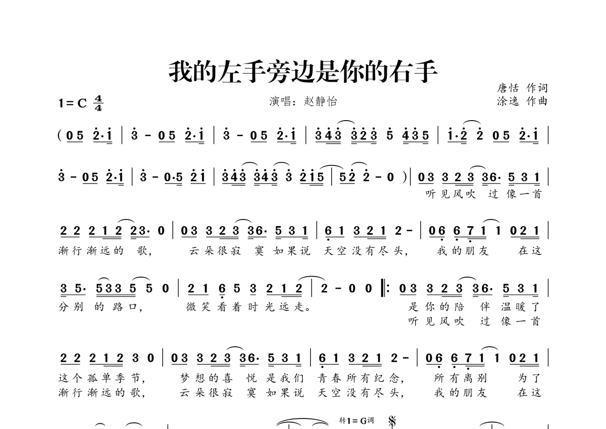 《我的左手旁边是你的右手》是赵静怡演唱的一首歌曲,拍号为4/4拍,这份简谱共有一张高清图谱,图谱由 @桃李醉春风 编配上传。