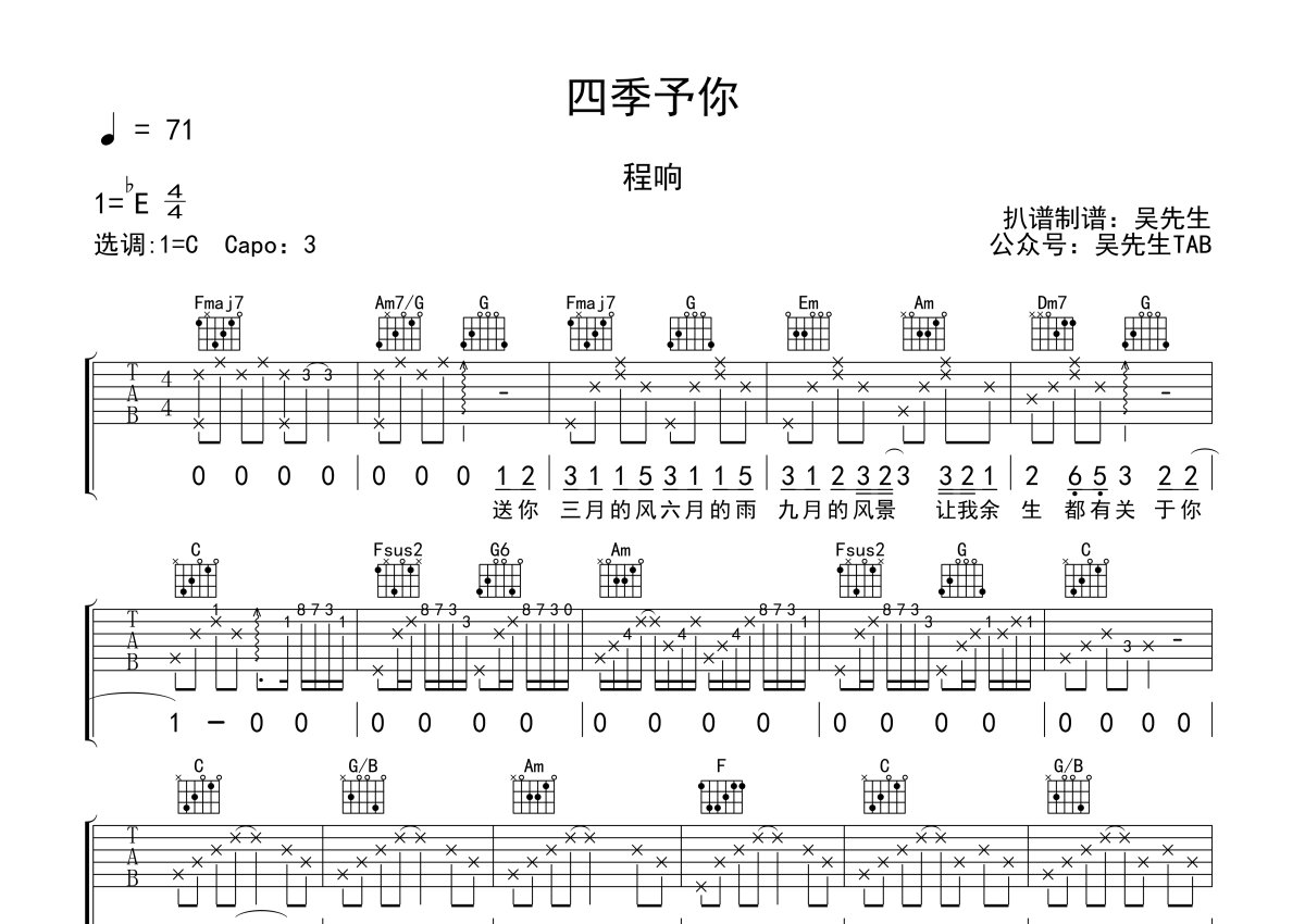 《四季予你》是程响演唱的一首歌曲,本吉他谱采用的是C调指法编配,这份吉他谱共有两张高清图谱,图谱由 @吴先生TAB 编配上传,图谱使用六线谱编配,包含吉他和弦指法、简谱以及歌词部分,使用这份四季予你吉他谱,可以让你更加方便地掌握这首歌曲的弹唱技巧,快来尝试吧。程响《四季予你》吉他谱_C调吉他弹唱谱。