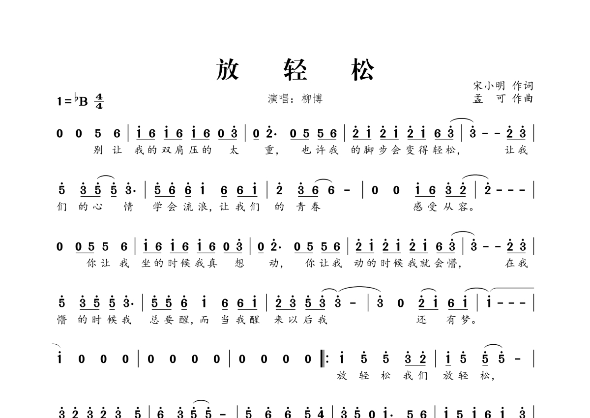 《放轻松》是柳博演唱的一首歌曲,拍号为4/4拍,这份简谱共有一张高清图谱,图谱由 @桃李醉春风 编配上传。