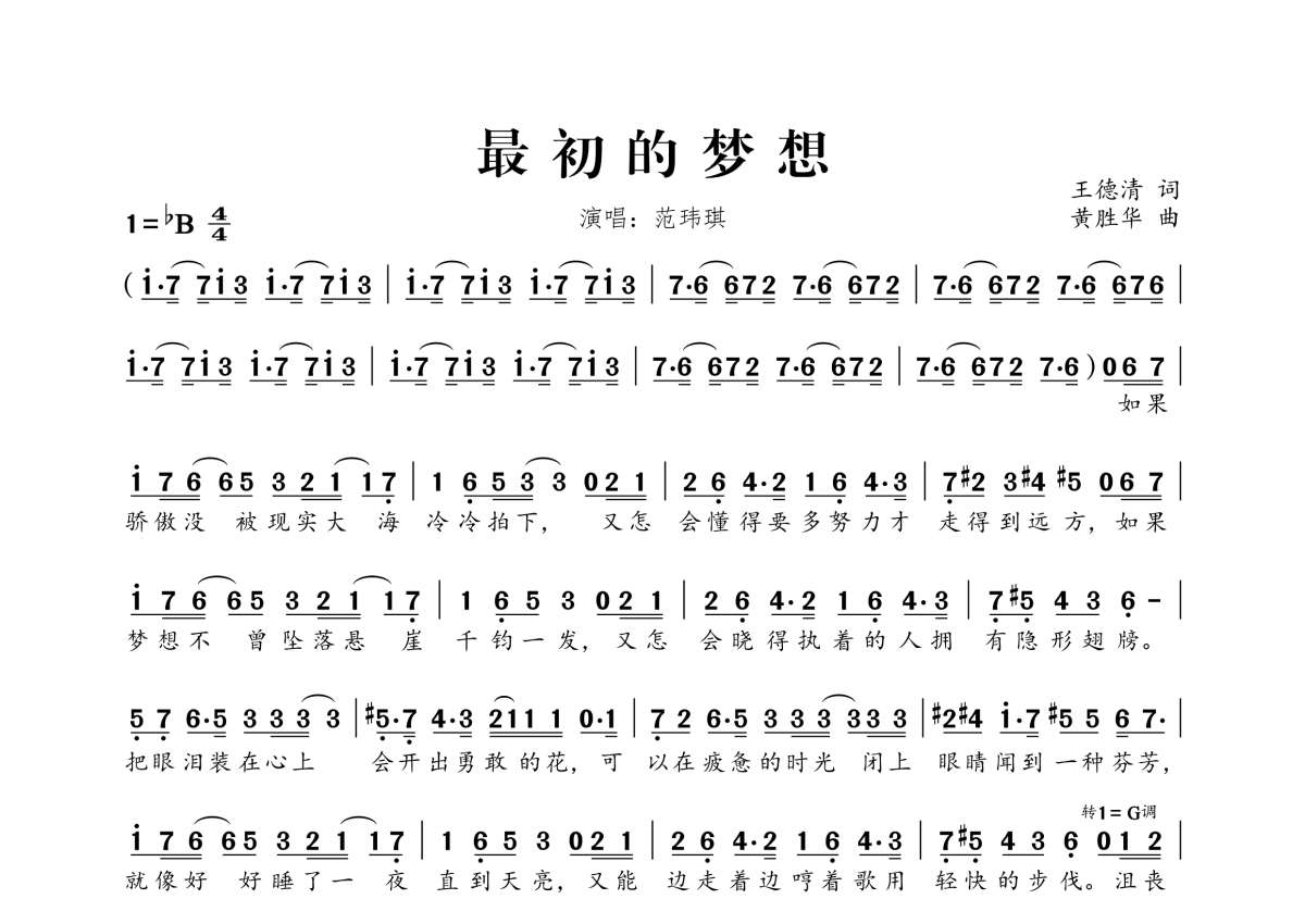 《最初的梦想》是范玮琪演唱的一首歌曲,拍号为4/4拍,这份简谱共有两张高清图谱,图谱由 @桃李醉春风 编配上传。