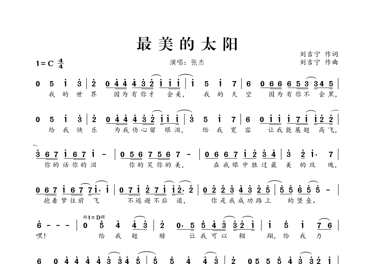 《最美的太阳》是张杰演唱的一首歌曲,拍号为4/4拍,这份简谱共有一张高清图谱,图谱由 @桃李醉春风 编配上传。