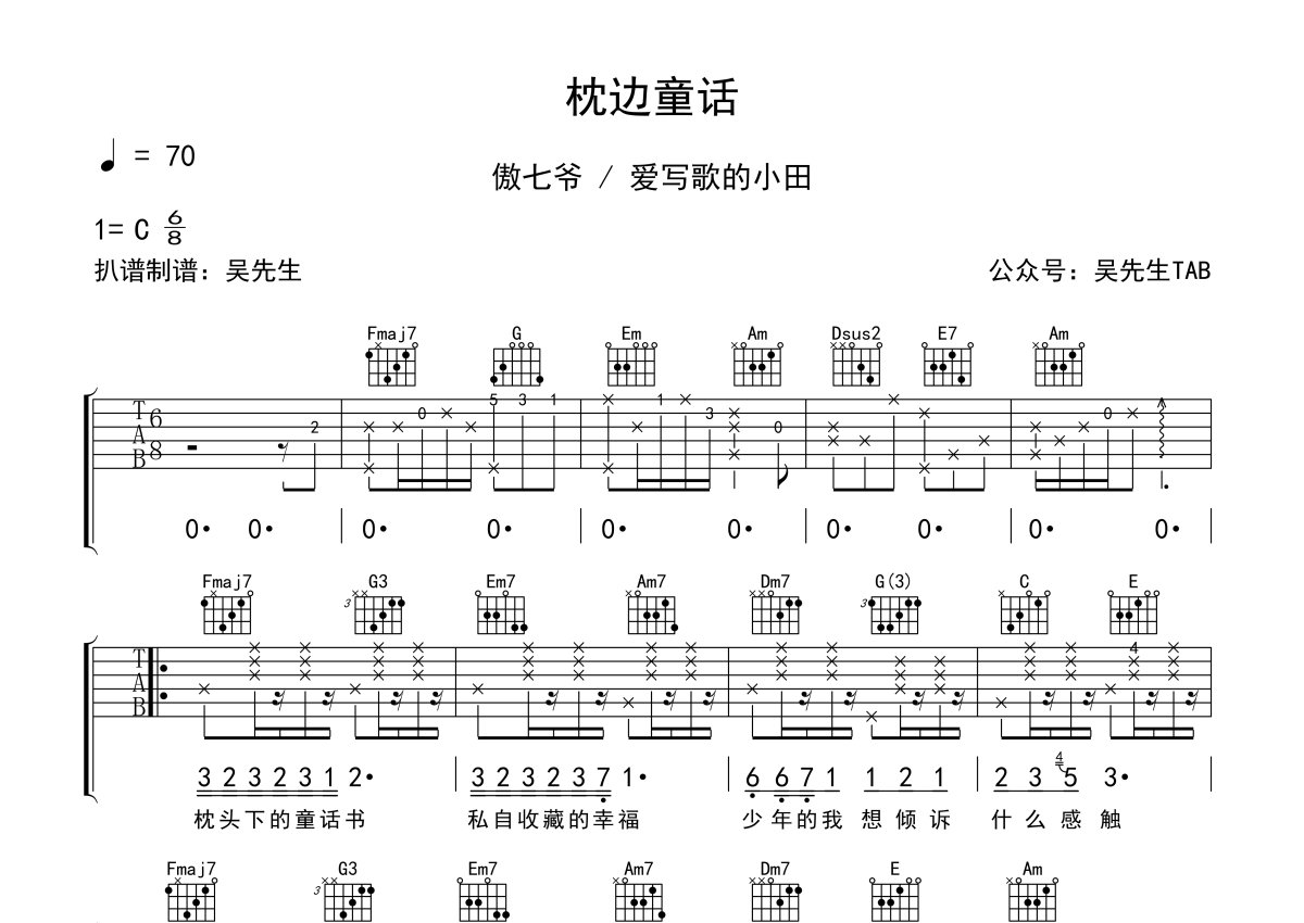 傲七爷 / 爱写歌的小田《枕边童话》吉他谱 - C调弹唱六线谱