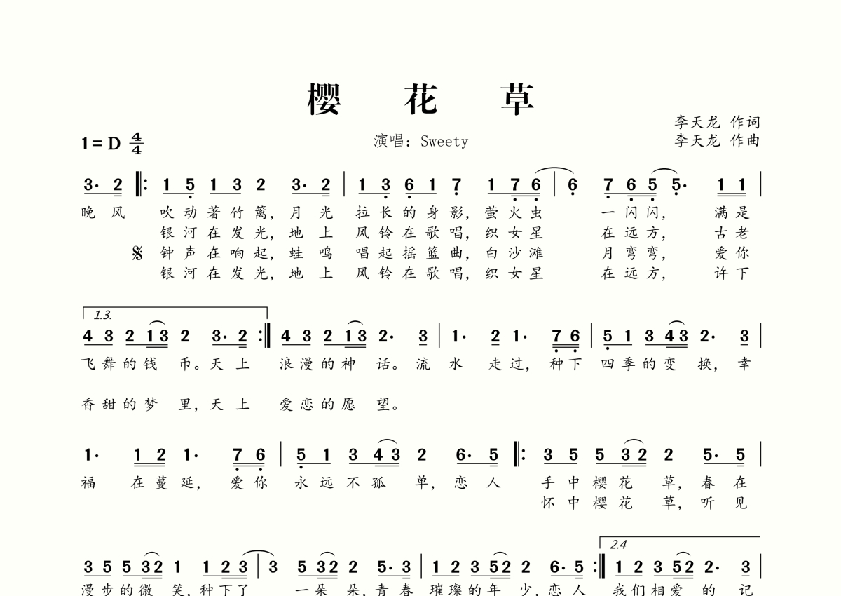 《樱花草》是Sweety演唱的一首歌曲,拍号为4/4拍,这份简谱共有一张高清图谱,图谱由 @桃李醉春风 编配上传。