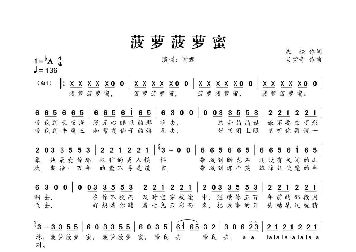《菠萝菠萝蜜》是谢娜演唱的一首歌曲,拍号为4/4拍,歌曲速度为每分钟136拍,这份简谱共有一张高清图谱,图谱由 @桃李醉春风 编配上传。