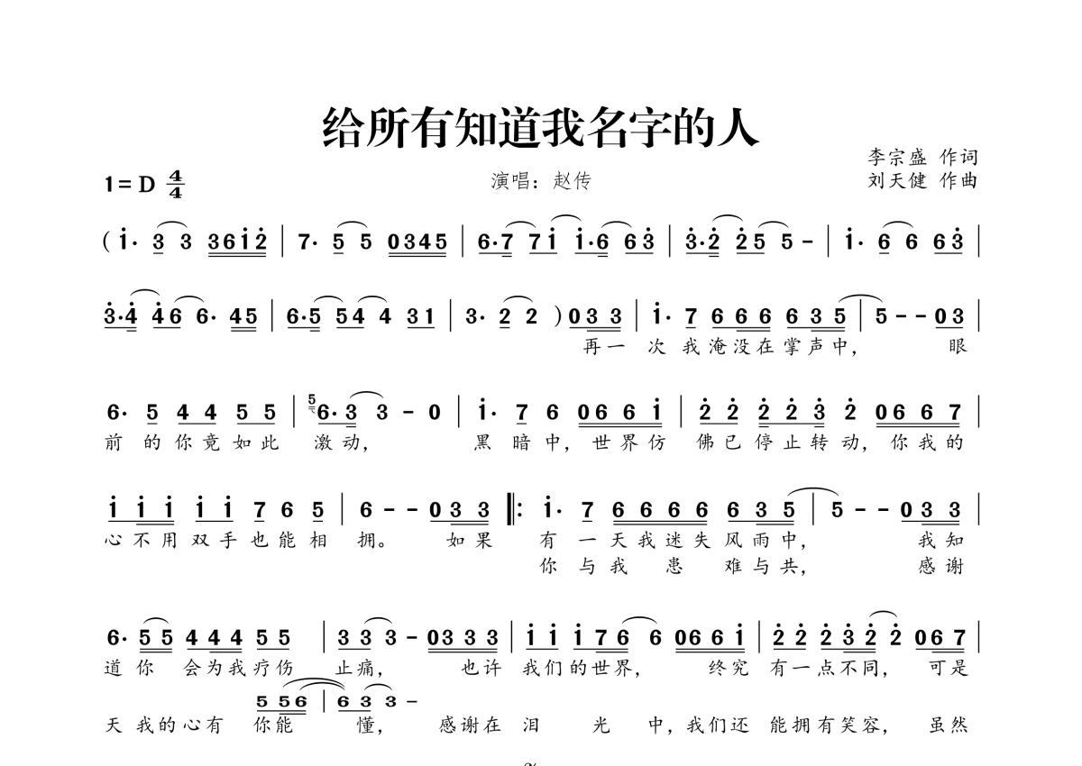 《给所有知道我名字的人》是赵传演唱的一首歌曲,拍号为4/4拍,这份简谱共有一张高清图谱,图谱由 @桃李醉春风 编配上传。