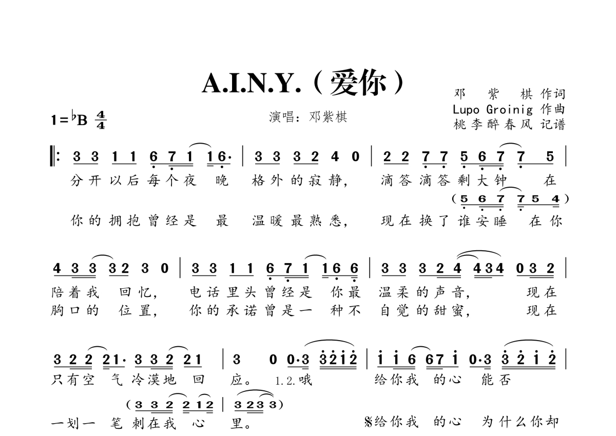 《A.I.N.Y.(爱你)》是G.E.M.邓紫棋演唱的一首歌曲,拍号为4/4拍,这份简谱共有两张高清图谱,图谱由 @桃李醉春风 编配上传。