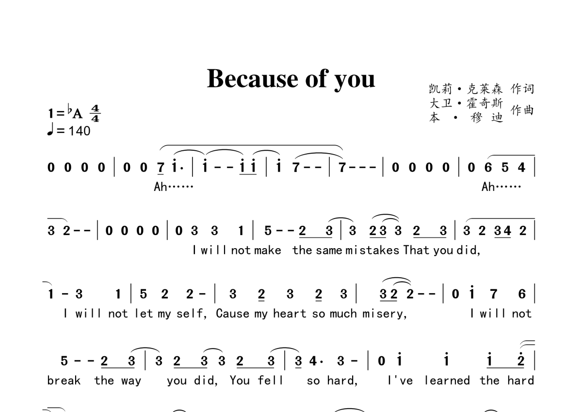 《Because of you》,拍号为4/4拍,歌曲速度为每分钟140拍,这份简谱共有三张高清图谱,图谱由 @桃李醉春风 编配上传。