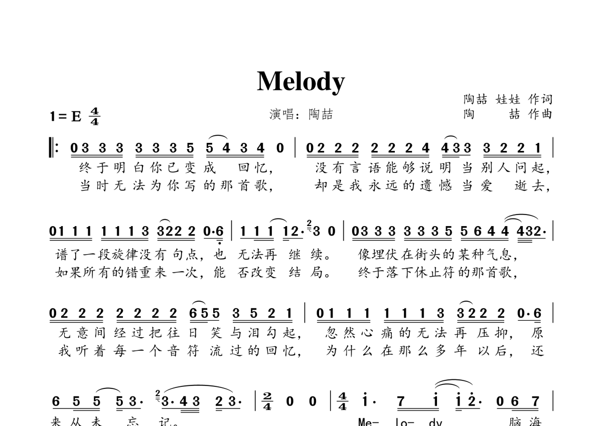 《Melody》是陶喆演唱的一首歌曲,拍号为4/4拍,这份简谱共有两张高清图谱,图谱由 @桃李醉春风 编配上传。