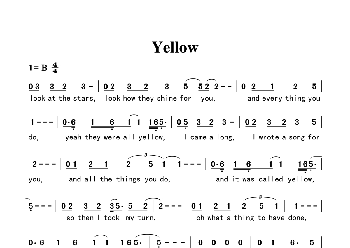 《Yellow》,拍号为4/4拍,这份简谱共有两张高清图谱,图谱由 @桃李醉春风 编配上传。