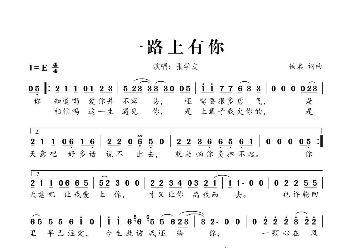 《一路上有你》是张学友演唱的一首歌曲,拍号为4/4拍,这份简谱共有一张高清图谱,图谱由 @桃李醉春风 编配上传。