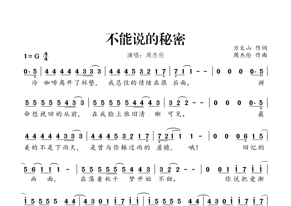 《不能说的秘密》是周杰伦演唱的一首歌曲,拍号为4/4拍,这份简谱共有一张高清图谱,图谱由 @桃李醉春风 编配上传。
