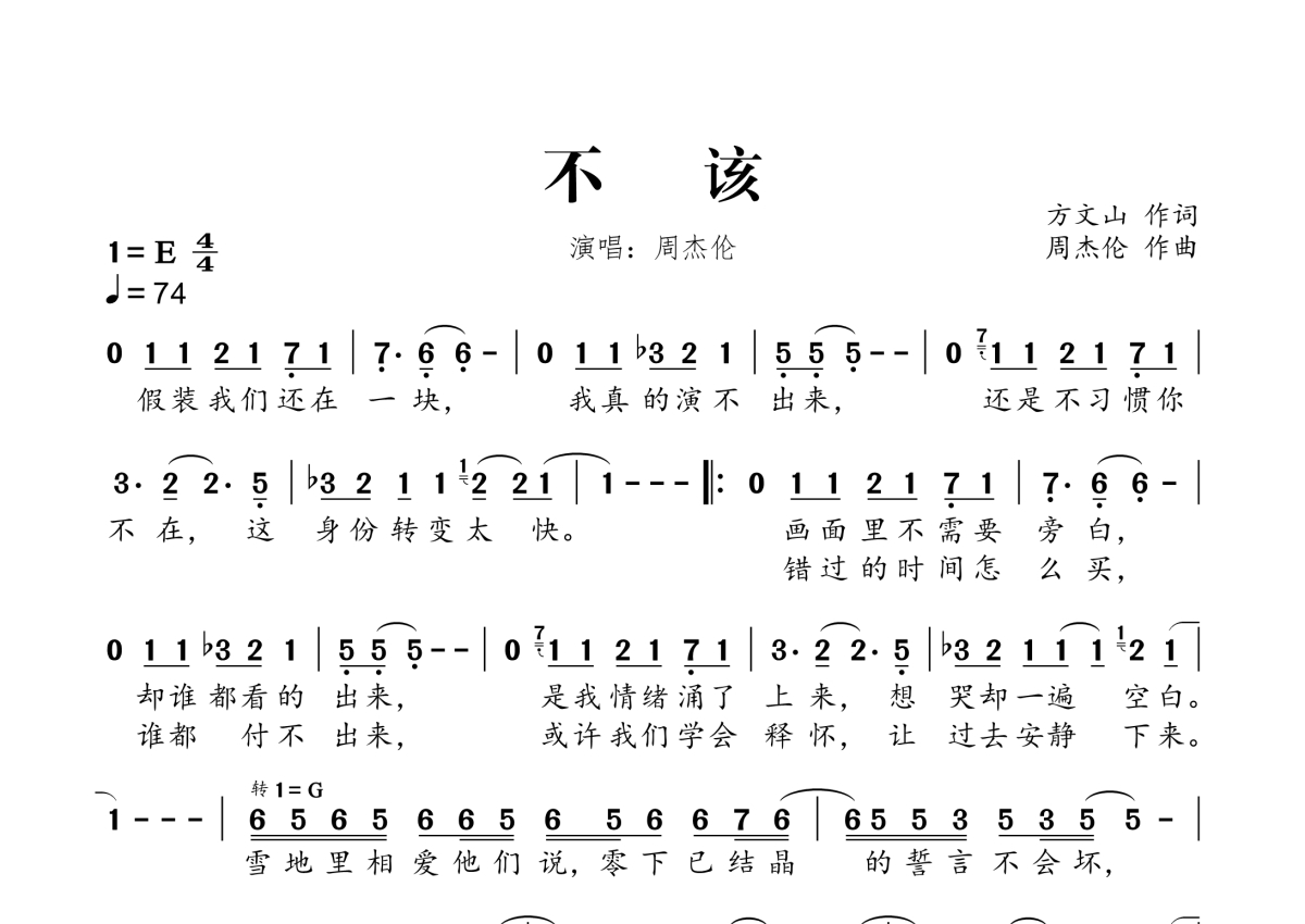 《不该》是周杰伦演唱的一首歌曲,拍号为4/4拍,歌曲速度为每分钟74拍,这份简谱共有一张高清图谱,图谱由 @桃李醉春风 编配上传。