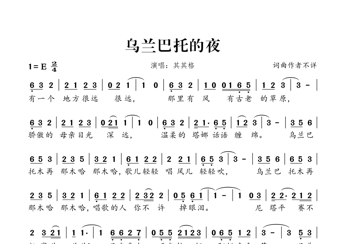 《乌兰巴托的夜》是其其格演唱的一首歌曲,拍号为2/4拍,这份简谱共有一张高清图谱,图谱由 @桃李醉春风 编配上传。