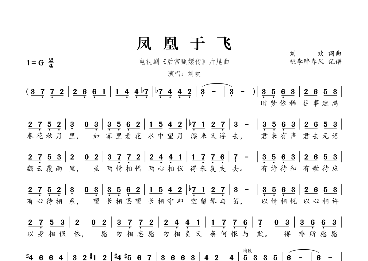 《凤凰于飞》是刘欢演唱的一首歌曲,拍号为2/4拍,这份简谱共有一张高清图谱,图谱由 @桃李醉春风 编配上传。