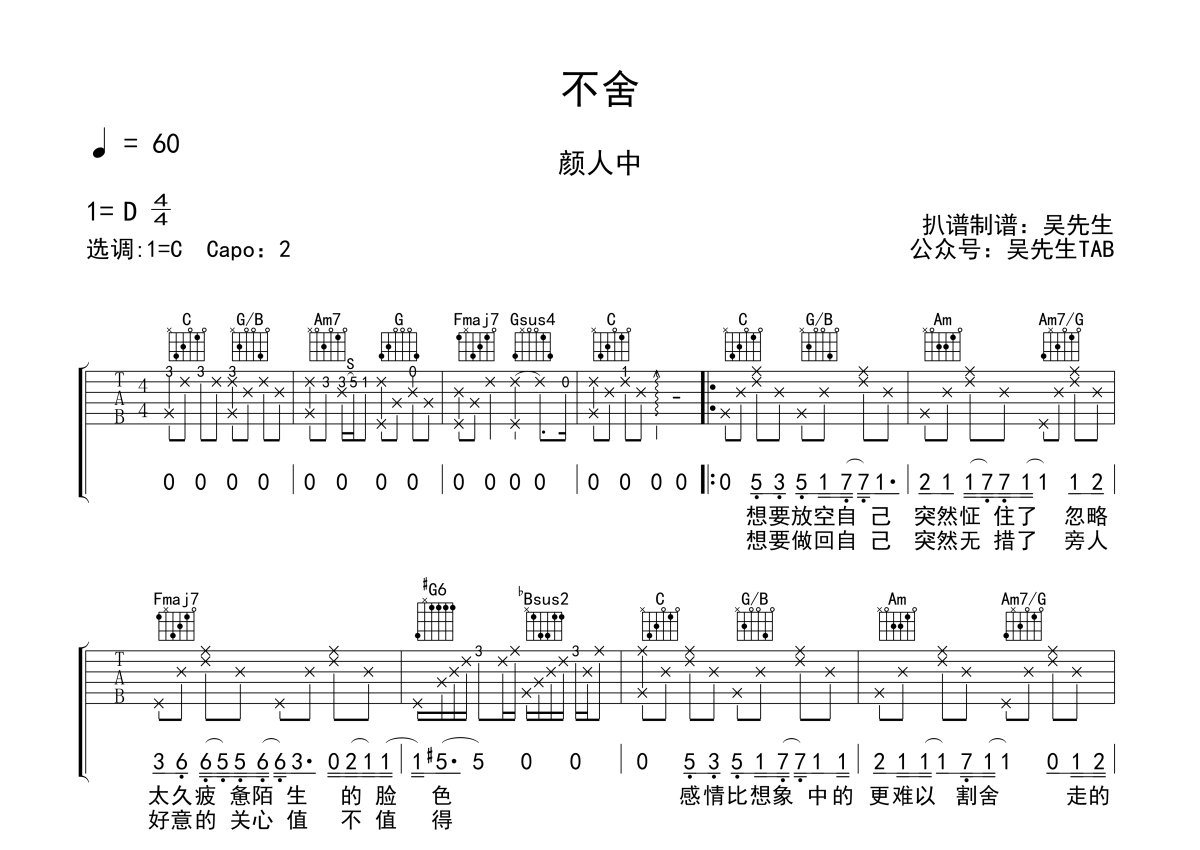 颜人中《不舍》吉他谱 - C调弹唱六线谱