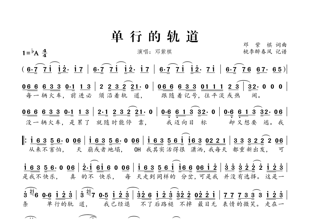 《单行的轨道》是G.E.M.邓紫棋演唱的一首歌曲,拍号为4/4拍,这份简谱共有一张高清图谱,图谱由 @桃李醉春风 编配上传。
