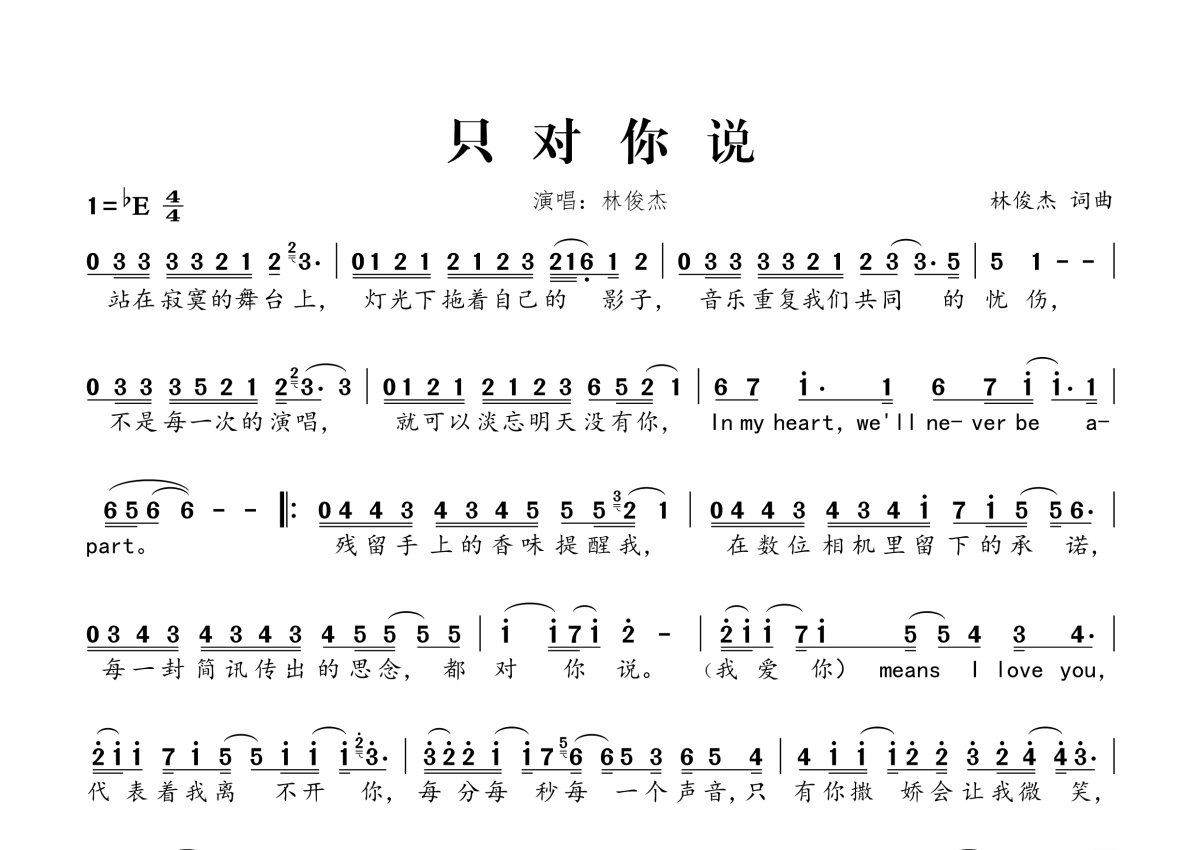 《只对你说》是林俊杰演唱的一首歌曲,拍号为4/4拍,这份简谱共有一张高清图谱,图谱由 @桃李醉春风 编配上传。