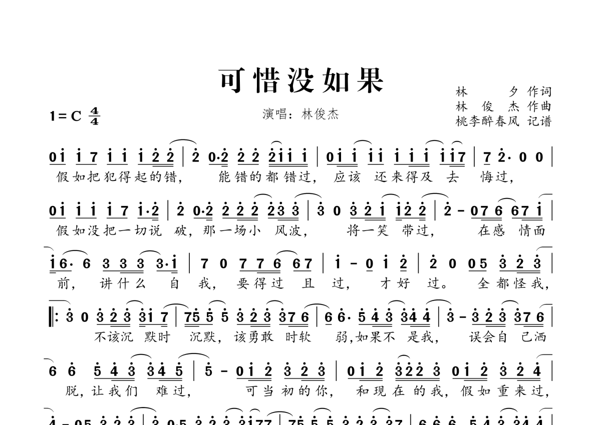 《可惜没如果》是林俊杰演唱的一首歌曲,拍号为4/4拍,这份简谱共有一张高清图谱,图谱由 @桃李醉春风 编配上传。